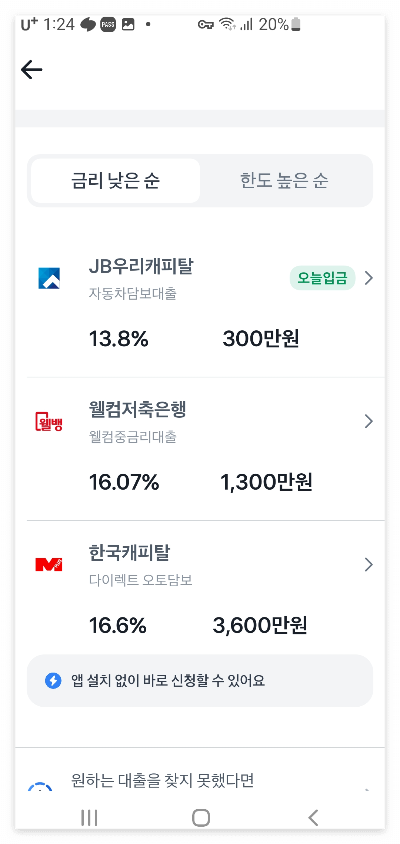 보시는 것처럼 제 신용 점수가 좋지 않고 기존의 대출이 많기 때문에 캐피탈이나 제2금융권 제3금융권에 대출 상품만 보여집니다
