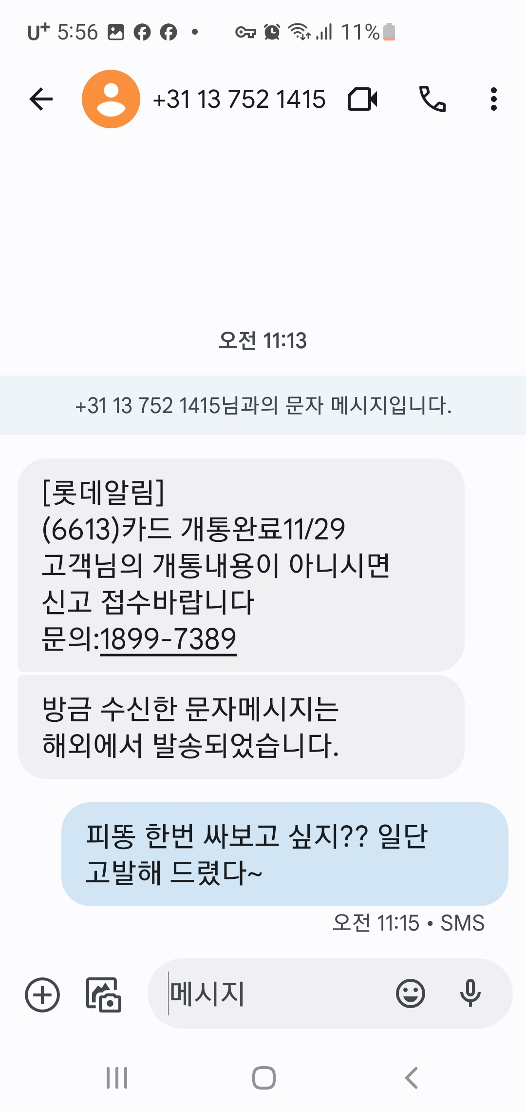 자주 봐왔던 문자의 형식이기 때문에 스팸이라고 생각하고 몇 글자를 보냈습니다
